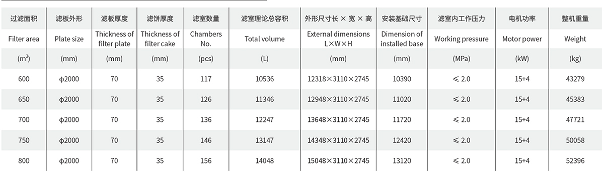 高壓壓濾機(jī)是集機(jī)、電、液于一體的固液分離機(jī)械設(shè)備,它主要由五大部分組成:機(jī)架部分、自動(dòng)拉板部分、過(guò)濾部分、液壓部分和電器控制部分??筛鶕?jù)需求增加接液盤(pán)、翻板、儲(chǔ)泥斗、水洗系統(tǒng)、濾布曲張架、氣卸料等。其結(jié)構(gòu)較簡(jiǎn)單,操作容易,運(yùn)行穩(wěn)定,保養(yǎng)方便;過(guò)濾面積選擇范圍靈活,占地少;對(duì)物料適應(yīng)性強(qiáng), 效率高,含水率低,適用于各行各業(yè)物料脫水處理。現(xiàn)已應(yīng)用于市政、礦山、紙業(yè)等多個(gè)大型固廢脫水處理行業(yè)。設(shè)備使用簡(jiǎn)單,操作、維護(hù)方便,是理想的固液分離設(shè)備。專(zhuān)利技術(shù)(專(zhuān)利類(lèi)型:發(fā)明,專(zhuān)利號(hào):CN104260402A),圓形濾板,濾板面結(jié)構(gòu)自主知識(shí)產(chǎn)權(quán)設(shè)計(jì),使用壽命長(zhǎng),密封性強(qiáng),不噴漿,耐高壓,過(guò)濾效果好,濾餅含固高。