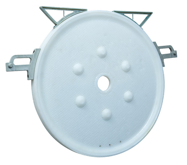 2、濾腔進(jìn)料孔附近均勻設(shè)有4只支撐柱,濾板成型后,整體強(qiáng)度加大,延長(zhǎng)使用壽命,濾餅直徑放大10mm, 確保產(chǎn)量不變;