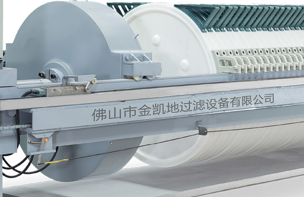 在污泥泵進(jìn)泥壓力達(dá)到設(shè)定壓力值后,污泥泵自動(dòng)停機(jī),進(jìn)泥閥自動(dòng)關(guān)閉,壓榨機(jī)的液壓系統(tǒng)自動(dòng)啟動(dòng),對(duì)進(jìn)入濾腔的污泥進(jìn)行二次壓榨,壓力高達(dá)65——110kg/cm2,濾室自動(dòng)調(diào)節(jié)壓縮,使濾餅在高壓力壓榨下將濾餅中的大部水?dāng)D出
