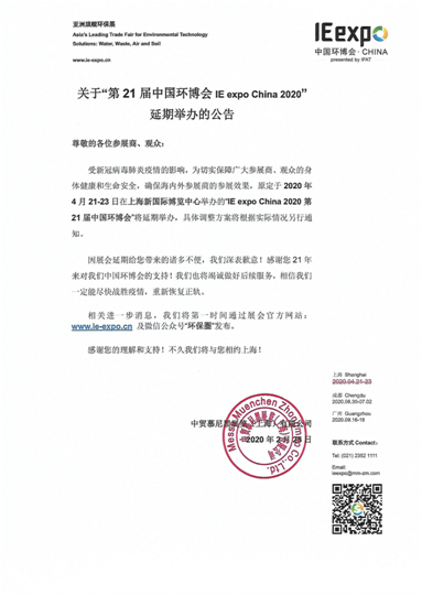 2月26日,中國(guó)環(huán)博會(huì)主辦方發(fā)布《關(guān)于“第21屆中國(guó)環(huán)博會(huì)IE expo China 2020”延期舉辦的公告》并宣布,原定于2020年4月21-23日于上海舉辦的第21屆中國(guó)環(huán)博會(huì)延期舉辦,“延期后的具體時(shí)間將另行通知”。