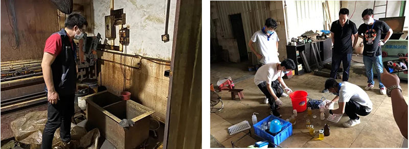 ▲執(zhí)法人員現(xiàn)場(chǎng)調(diào)查取證、監(jiān)測(cè)單位現(xiàn)場(chǎng)取樣