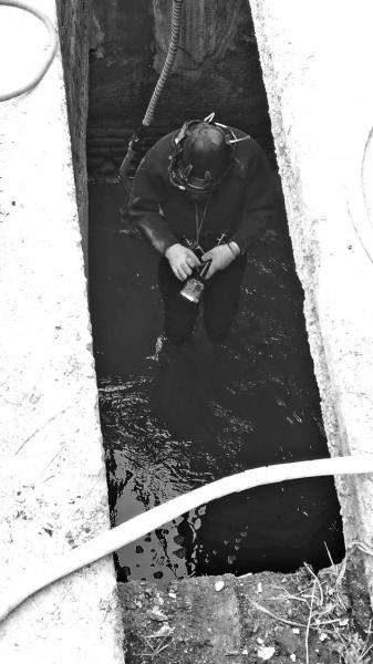 在廠區(qū)內(nèi),環(huán)保人員撬開(kāi)一塊松動(dòng)的蓋板。隨后,專業(yè)的蛙人佩戴好呼吸器、氧氣瓶,帶上強(qiáng)光手電進(jìn)入暗涵。蛙人經(jīng)過(guò)近20米的仔細(xì)排查后,終于在暗涵內(nèi)發(fā)現(xiàn)有一根直徑約15厘米的PVC管道,管口呈紅色。