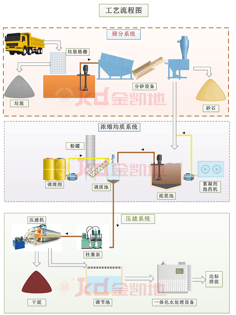 針對河道污泥特點,工藝方案需以泥樣分析實驗為基礎(chǔ),設(shè)計一系列的流程解決相關(guān)問題。同時方案也和河道清淤方式相關(guān),如采用絞吸船清淤,則污泥含水率較大,需比較大的泥漿池儲存和濃縮污泥。如采用挖掘機清淤,則污泥含水率小,但含有的垃圾砂石較多,需采用對應的分離清楚設(shè)備和工藝。以下為金凱地壓濾機廠家設(shè)計的常規(guī)處理工藝: