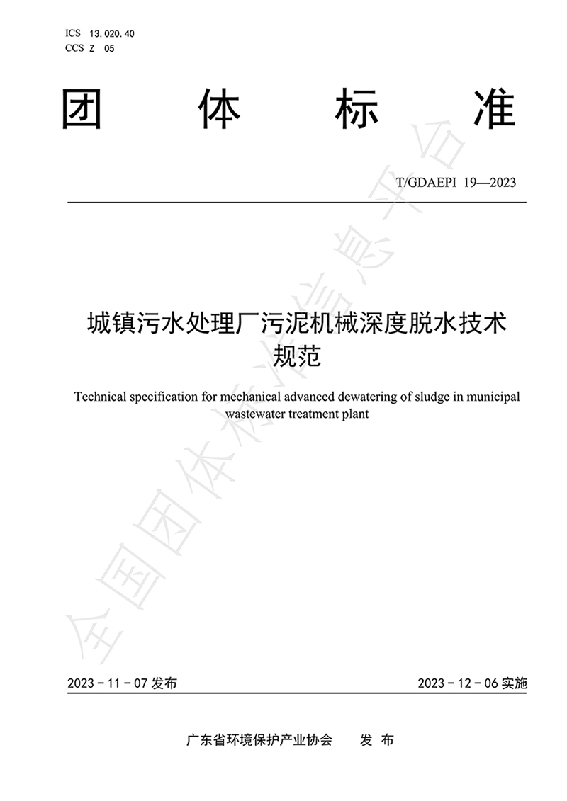 2023年11月7日,我司參與起草制定的《城鎮(zhèn)污水處理廠污泥機(jī)械深度脫水技術(shù)規(guī)范》(T/GDAEPI19-2023)經(jīng)廣東省環(huán)境保護(hù)產(chǎn)業(yè)協(xié)會(huì)正式發(fā)布。