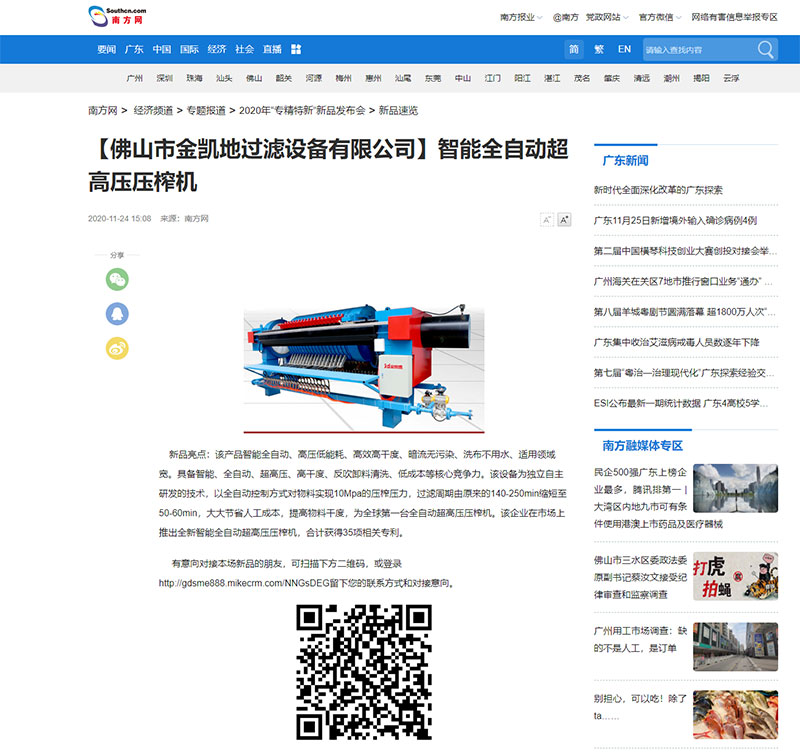 2020-11-24日南方網(wǎng)發(fā)布2020年“專精特新”新品智能全自動超高壓壓榨機,金凱地過濾設(shè)備有限公司的智能全自動超高壓榨機成功入圍2020年“專精特新”新品前三名。
