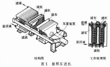 板框壓濾機(jī)由交替排列的濾板和濾框構(gòu)成一組濾室。濾板的表面有溝槽,其凸出部位用以支撐濾布。濾框和濾板的邊角上有通孔,組裝后構(gòu)成完整的通道,能通入懸浮液、洗滌水和引出濾液。板、框兩側(cè)各有把手支托在橫梁上,由壓緊裝置壓緊板、框。板、框之間的濾布起密封墊片的作用。由供料泵將懸浮液壓入濾室,在濾布上形成濾渣,直至充滿濾室。濾液穿過濾布并沿濾板溝槽流至板框邊角通道,集中排出。過濾完畢,可通入清洗滌水洗滌濾渣。洗滌后,有時(shí)還通入壓縮空氣,除去剩余的洗滌液。隨后可自動(dòng)打開濾室卸料..然后重新壓緊進(jìn)行下一班過濾。