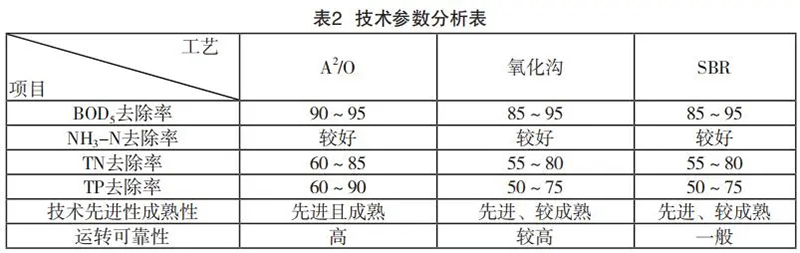 A2/O工藝、SBR工藝和氧化溝工藝的工藝技術(shù)分析和技術(shù)參數(shù)分析見(jiàn)表1和表2。