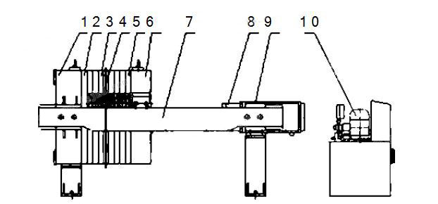1、止推板 2、頭板 3、濾板 4、濾布 5、尾板 6、壓緊板 7、播梁 8、液壓缸 9、液壓缸座 10、液壓站