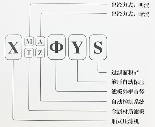 S代表過濾面積,Q代表千斤頂壓緊,J代表千斤頂壓緊,機(jī)械保壓,Y代表自動(dòng)壓液壓壓緊,Z代表自動(dòng)壓濾機(jī),D代表圓形濾板,K代表增強(qiáng)聚丙烯濾板,T代表金屬材質(zhì)濾板。